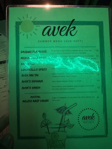 Read moreA random discovery, but Avek was a great find! Found this cool bar with a friend had an absolute great time.. An off the mainstream, non-cliche bar. So refreshing! Bartender was cool and knowledgeable. Ătienne suggested some great drinks like the white amaretto sour. Going to be my new regular cocktail bar. If your in town and want a non tourist quality cocktail...