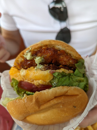 Passons au burger «âŻThe NolaâŻÂ», qui met Ă lâhonneur un filet de poulet frit. La panure Ă©tait impeccable, bien dorĂ©e avec des bords lĂ©gĂšrement brunis, croustillante Ă souhait tout en conservant une viande tendre et juteuse Ă lâintĂ©rieur. Les ingrĂ©dients se mariaient bien : pickles, salade iceberg et oignons confits, le tout relevĂ© par une sauce moutarde Ă lâamĂ©ricaine bien gĂ©nĂ©reuse. Petit dĂ©tail que jâai particuliĂšrement apprĂ©ciĂ© : la fourme dâAmbert. Moi qui nâaime habituellement pas les fromages au goĂ»t trop fort, celui-ci se sentait juste ce quâil faut, sans Ă©craser les autres saveurs. En rĂ©sumĂ©, un burger gĂ©nĂ©reux et savoureux qui a dĂ©passĂ© mes attentes. đ