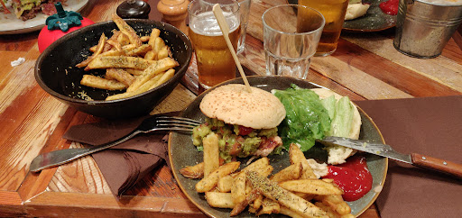 Read moreOn y est allé en groupe. Deux burgers végétarien, une salade césar et des burgers classiques. Bon commençons par le service. Notre hotesse, fort sympatique, maîtrisait visiblement trop mal le français pour nous comprendre clairement. Peut être que l'heure tardive à laquelle nous sommes arrivés (22h45) explique sa fatigue visible, mais pas le ton fort peu courtois employé. Une bière n'a pas été servie, car il n'y avait plus de verres... Portnawak. Le serveur ne se cassait pas trop la tête. Il déposait les plats a un endroit de la tablée, et ensuite c'était à nous de nous demerder pour savoir à qui était le plat au final. Comme on comprenait mal ce qu'il disait, cela n'a pas aidé à savoir qui devait avoir quoi. Le principe du burger avec du pain sec est un concept auquel on n'adhère pas unanimement. Un des burger végétarien était tellement raté qu'on l'a renvoyé en cuisine. Et au retour, surprise, pain moelleux, chaud, contenu bien cuit, guacamole en grande quantité. Bref pour être bien servi il semble qu'il faille raler, sinon on récupère le vieux pain pourri et des doses de bagnard. Unanimement on a apprécié le nouveau plat, mais cela nous a fait découvrir qu'on avait été mal servi (on s'en doutait du reste). On a même demandé si le cuisinier avait été changé récemment, comme on vient souvent, on en a goûté quelques uns des burgers ici... mais jamais des aussi mauvais. Et jamais autant le même soir. Et il y a eu un changement récent dans le cheddar fondu, on n'aime pas le nouveau cheddar. Servi avec une croûte sèche sur le dessus, tiédasse, il tire sur le jaune ce qui n'est pas la couleur habituelle. Quant au goût, on n‘aime pas. Il accompagne les frites, mais sa consistance rend très difficile son utilisation avec des frites. Bref, c'était un repas bien pourri, et on ne reviendra pas, certaines choses ont changé,...