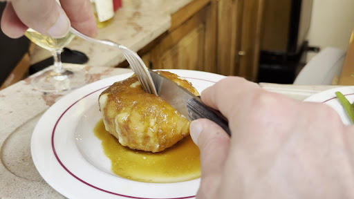 Mains: chicken cordon bleu with haricot verts and pepper steak with frites. The cordon bleu was an unexpected hitâ the best version of that Iâve ever had (and Iâm not a chicken person). Even the haricot verts were better than they had any right to be. Ordered at the suggestion of the darling hostess, they were fresh and flavorful. My steak was cooked perfectly (bleu) and the pepper sauce was a luxuryâ so flavorful and rich. Great frites as well (swiped through that sauce? Magnifique!). A wonderful and not-too-pricey bottle of red complimented both mains.