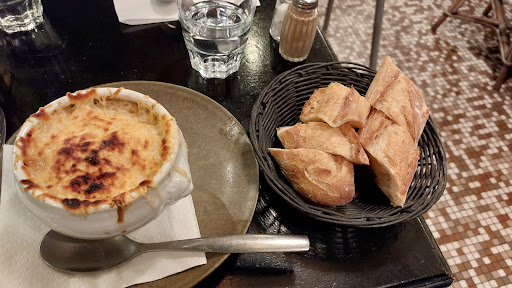 Read moreI really enjoyed my french early dinner here . I server was Sarah and she was excellent and made me comfortable .She helped me decide what to eat and gave me time because I got full and took a break. I wanted to order everything frenchy so I had the onion soup which was very good . I tried the escargot which were not bad they had a basil paste on them and were a little on the salty side but not too much. I ended up ordering the salad with the goat cheese which was very flavorful and creamy the cheese . The salad dressing was very good also . For dessert I ate the chocolate cake it came with a scope of vanilla ice cream it was light and not too sweet for chocolate cake . I really enjoyed everything from the atmosphere to the place itself had a warm feeling the energy was good upstairs they had a comedian and during my early dinner the place got busy because I got here early. I made some food video on how to get the escargot out of the shell . Its on my instagram if anyone is curious . I highly recommend...