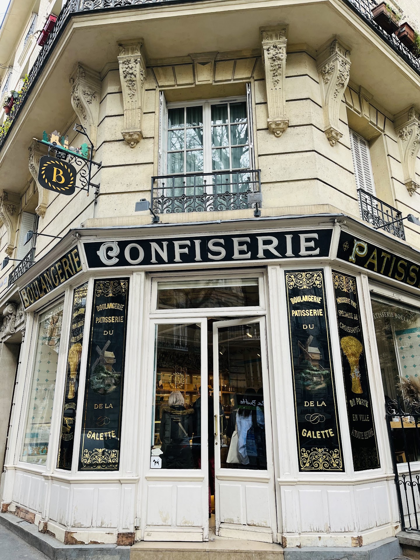 The entrance to the bakery features white walls with white rectangles slightly outset from the walls, outlined in gold. The windows are tinted dark black with capital letters in gold. Six of the windows (appearing in pairs) have a golden design, each depicting a peel, grains of wheat, and a croissant as the logo. In the center of two of these pairs is an arch window, outlined in white. Above each arch is a small rectangular clear window. The door is styled similarly to the outside walls, with the same black window, gold lettering, and white outline. Above the windows and door is a white overlap with ridges, gold lettering, and a black background.