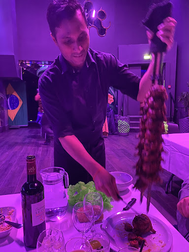 La nourriture était moyenne, voire nulle quand on pense au prix. L’entrée, deux canapés saumon et foie gras, les mêmes que je fais à la maison. Puis sont servis du taboulé et de la carotte/chou râpé. Je mettrais ma main à couper qu’il s’agit des barquettes que l’on trouve au rayon frais des supermarchés. J’en mange le midi au travail et je n’ai vu aucune différence. Ensuite vient la farandole de viande, il faudra compter entre 10 et 20 min à chaque viande. On ne sait pas s’il faut commencer à manger ou attendre que tout arrive. En plein milieu arrivent les haricots rouges avec le riz mi-cuit mi-croustillant. Certaines viandes plutôt bonnes et d’autres extrêmement salées au point de ne pas pouvoir les manger. Le dessert, une blague… un éclair au chocolat puis des mignardises… juste dégueulasse. Une bouchée et nous avions terminé.