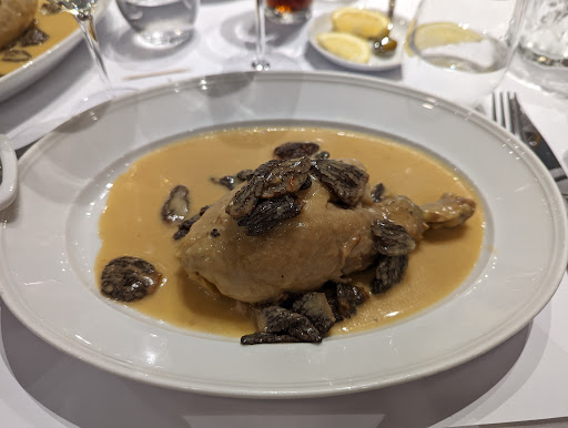 Late lunch on 09/07/23 (mm/dd/yy): Bresse chicken with morel mushrooms, octopus with lentils, crepe Suzette, and raspberry and lemon sorbet. Chicken meat was super tender (not sure if it should remain pink near the bones and all of the wing parts though). Morel mushrooms reminded me of the morel soups served on KLM flights. Octopus dish was just ok. Crepe Suzette prep is a good show. Selected sorbets were good. The service was excellent on this occasion. We had a good time.
