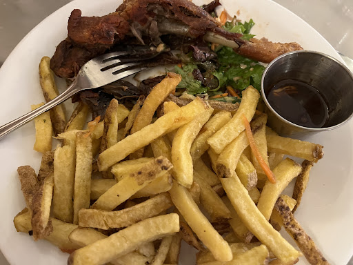 Nous sommes arrivĂ©s en fin de service pour le dĂ©jeuner et avons commandĂ© deux plats du jour : confit de canard avec pommes de terre rissolĂ©es Ă lâail. Ă notre grande surprise, les assiettes nous ont Ă©tĂ© servies avec des frites Ă la place des pommes de terre rissolĂ©es, sans que le changement ne nous ait Ă©tĂ© signalĂ© ou mĂȘme proposĂ©. En goĂ»tant, le canard sâest rĂ©vĂ©lĂ© sec et peu savoureux, loin de la tendretĂ© attendue dâun confit.