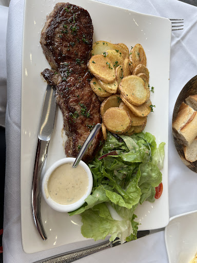 There is a prepared menu as well as daily specials for lunch and dinner. One special was a seared veal chop in a white wine, cream and veal stock reduction with fresh tagliatelle and mushrooms. Nice char and seasoning on the veal done to a medium rare, sauce was very good complementing the meat and the pasta. Another special was a tender sirloin grilled to a perfect rare as requested with a Bleu d Auvergne sauce. Both came with a small fresh, crisp side salad in Dijon vinaigrette, slices of warm baguette. While waiting on the meal, bread and a bowl of black and green olives with herbs de provence helped whet the appetite. Everything was very good. We ate in the sunroom where the tables were rather close.