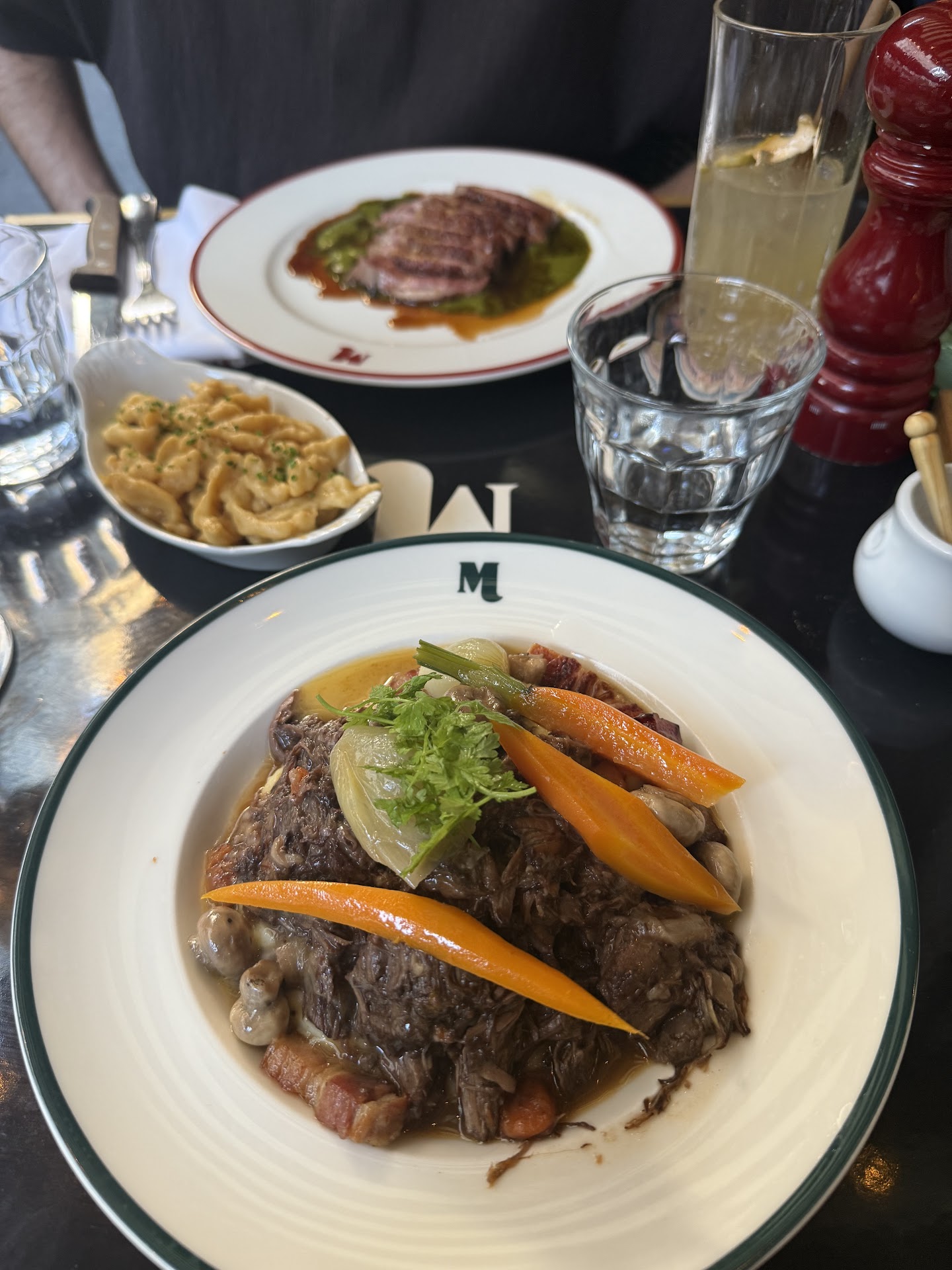 Read moreLovely terrace, very nice menu - took the saucisse/ puree and vegetarian special for lunch today. Everything was delicious. Unfortunately, the service was terrible. The wine did not come in time for our first course, and we had to ask a busser for it for it to arrive at all. Our main course took quite some time- understandable - it was busy at the time. We did eventually ask for it- and it arrived. As I said- very good. We were there quite a while. The service was ending, and we sat with dirty plates for long time while people cleaned the tables next to us. No one asked us for our dessert order. The server walked back and forth without acknowledging us. Finally, we told one of the people wearing a white t-shirt- very kind and warm young man- that we would order the cheese for dessert. I watched as this gentleman told our waitress who stood not five feet away. The cheese didn't come. Meanwhile, the terrace is almost empty. The cheese isn't coming. After 15 minutes, I finally manage to hail the waitress and said, "on avait commande du fromage." And she said, "Oui. Oui, C'arrive toute suite." And yet ... it didn't. She continued to seat an occasional table, take orders- and we waited. Finally, I got up to use the restroom and my husband asked for the check without the cheese. Again, we waited. Finally, we stood up to leave and the check appeared. This experience was disappointing to say the least. It's really too bad too- it seems like a great restaurant. After this treatment, however, I would not eat there again and I can't...
