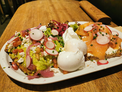 To start with the positive sides, the food was great and really worth its price! I had the mixed "tartines", one with avocado & the other one with salmon, with 2 eggs that went along with the dish, which made the whole thing VERY filling! For 13,50€ I had that and a flat white with oat milk. Unfortunately, the coffee was really far from good 🙁 Tasting really watery & without much of a taste of coffee. The service was average, I had to repeat my order 3 times when ordering because the lady at the cash register didn't pay attention and my coffee arrived after my food did 🤔 Besides that, the place was veeery calm after 4:30pm (I arrived a bit before 4pm), so if you're looking for a calm place to read, this might be good for you. Otherwise, that's more of a personal preference, but the place is a bit too dark for my taste. While the majority of the chairs in the café don't have back support, I managed to snatch one of the few tables that had a comfortable one, so to keep in mind when coming too. All in all, there were parts I liked & parts I didn't. I'd come again if nothing else was open, but otherwise, not...