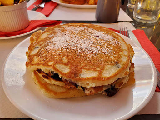 I've come here twice now, the first time ordering Blueberry pancakes and chili. The blueberry pancakes were massive and came out piping hot. They were delicious. My only mistake was not upgrading to the real maple syrup- something I will have to try in the future. Then again, fake maple syrup is quite American now isn't it. The chili was alright - nothing like the Dennisons brand I was hoping for but still tasty. The major downside was the wasps - since there is always syrup at the tables we were constantly fighting wasps landing on our food and us. The second time we gave this place a try was a month later on a Sunday. I ordered the Brunch menu and, learning from my previous mistake, ate indoors this time. I ordered a hot chocolate (delicious), orange juice (refreshing), Mexican omelet (disappointing), house potatoes (meh), and pancakes, which were mediocre after my experience with the delicious blueberry pancakes before. The Mexican omelet was disappointing because there was something like a canned Pace salsa inside instead of real salsa. Furthermore, sitting indoors gave me more the feeling of the place being a bit dirty. All that said, I still give it three stars and it's a good attempt at bringing a piece of the US into a French space. Not quite the transformative experience I read in other people's reviews, but I'll probably find myself back here to try some...