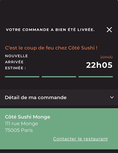 Read morePremière commande en ligne depuis le remplacement de l'ancienne enseigne (essayer de prononcer rapidement 😉) par Côté Sushi: plutôt pas mal, la carte est attractive et les tarifs alignés sur ce qui était fait précédemment. Le saumon des sashimi était un peu gras, reste à voir si cela est récurrent. En termes de déco, pas de critique particulière étant donné que je n'ai fait que passer, mais je trouve l'ambiance un peu sombre tout de même. Mise à jour 18/07/25: toujours rien à dire sur la partie produits (toujours aussi bons), mais j'ai été déçu par le service. Je comptais dépenser un paquet de tickets restaurant - indiqués comme acceptés - lors de ma commande mais on m'a indiqué en magasin qu'ils venaient de changer leur politique à cet égard. Je peux comprendre le déphasage des informations mais pas l'absence de geste commercial (et je ne parle pas de recevoir une...