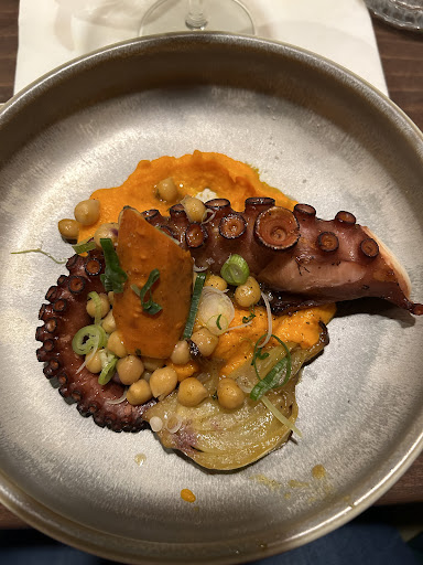 Read moreDîner à la mode des petites assiettes à partager. Ma compagne et moi ayant des goûts différents, nous avons plutôt décidé de prendre des mets différents. Ma compagne a pris un œuf mollet, cuit correctement mais servi froid, accompagné d'une crème de maïs avec des popcorn et une huile pimentée. Pas mauvais mais pas excellent non plus. Pour ma part j'ai opté pour une seiche dont la cuisson était parfaite accompagnée d'haricots blanc qui eux étaient fades, ou du moins seulement accompagnés du goût de cette même seiche. Nous avons tous les deux ensuite pris la bavette ( comprendre en réalité un quart d'une bavette coupée en deux morceaux assez chiches) accompagnée d'une purée de céleri aux 5 épices (absentes) qui était donc très décevante. Surtout en prenant en compte les 17€ demandés pour. Donc soit bien trop cher soit bien trop petit. Viennent ensuite les desserts : tarte aux figues ( absolument délicieuse selon ma compagne) accompagnée d'une glace pistache fleur d'oranger, mais visiblement la pistache s'est transformée en banale vanille, et une pavlova accompagnées d'un sorbet abricot mangue qui aura brillé par son absence de l'assiette (on me l'a cependant fait déguster a part lorsque j'ai signalé l'oubli, bon point elle était très bonne).