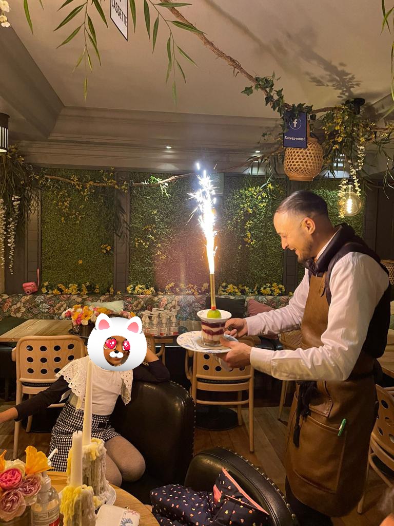 Very beautiful restaurant!! We were a group of 8 people, 6 adults (couples) and 2 children, looking around for somewhere to dine around 10pm, and we found this boho romantic restaurant, with a girly vibe (very instagrammable). There is plenty of plastic flowers around, fake grass murals, with candles all around ( on a wax melted candlestick). The lights were dimmed to create an ambiance. There are a lot of food platters to share, as well as menu à la carte, it's a bit pricey for the quantity they serve but ,I think you pay for the experience and being in the center of Paris too. The beef tartare was good according to the people who chose, i chose a bavette, it was good but not wow, the meat a bit bland, its 180g and not as tender, it had caramelised onions, a small portion of fries and 3 or 4 arugula leafs . The desserts : we ordered creme brûlée which is a big portion, served on a skillet and it was fine, a chocolat biscuit which ganache which was also a big portion and a red fruits tiramisu which i found a bit bitter, it gives you that zesty sensation at the bottom of your tongue that makes you close your eyes, but the cream and the biscuit were fine. Due to the time we arrived, we couldn't take longer to order as the kitchen was about to close, so the waiter was a bit stressed and not very sympathetic,but we understood, the other waiter that came to bring the desserts was way more friendly and even played and talked with the kids. The toilets were the part where I didn't love at all, the decor is great, but it was smelly and dirty( also I give the benefit ou doubt because it was almost end of the day,near closing time, but the kids needed to go and I wasn't happy neither comfortable to let them use in those conditions). The terrace is also beautiful, a great spot for summer or more warmer days, I will definitely return once more in normal hours and during the day for a...