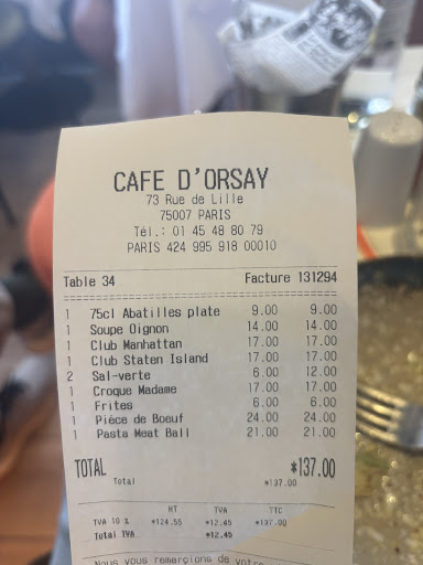 After a few hours of walking around the Musee d’Orsay we walked into a nearby restaurant that said that they were a steakhouse and had a good rating overall, so we decided to enter despite seeing slightly elevated prices. We entered and they asked us where would we like to sit. When ordering food, we asked for water (normally free in France). When they brought water it was a labeled 0.75 bottle of water, it was evident that we would have to to pay for…(NINE EUROS!!!), and the waiter declined changing it for tap as “the bottle is already opened” (not in our sight btw)… We thought that we detected a tourist trap scam and it was unpleasant enough. However, we were not even close to anticipating a second hidden charge. When taking the order for sandwiches, the waiter asked “do you want it with a salad or fries”, and we made the choice. Imagine our surprise when we saw these sides in the bill - 6 euros for a small bowl of lettuce or a tiny bucket of fries! So in total we had unexpected +27 euros in our bill.