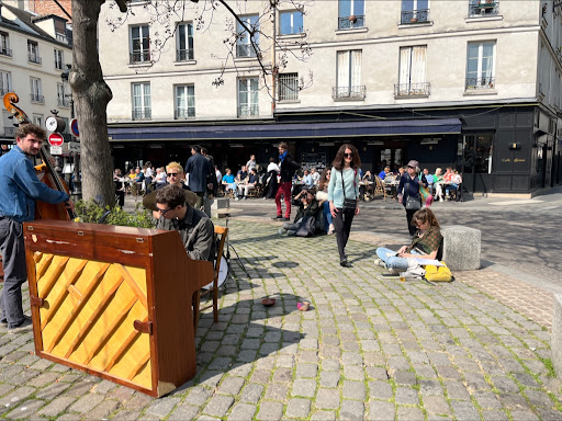 Had lunch after wandering Rue Mouffetard. Sat outside on a beautiful sunny day. Short wait for a table. 3 salads, 2 special Caesar with deep fried chicken tenders and another salad with Serrano ham. Mine was slightly over dressed but good nonetheless. Nice wine by the glass list including one special. Jazz...