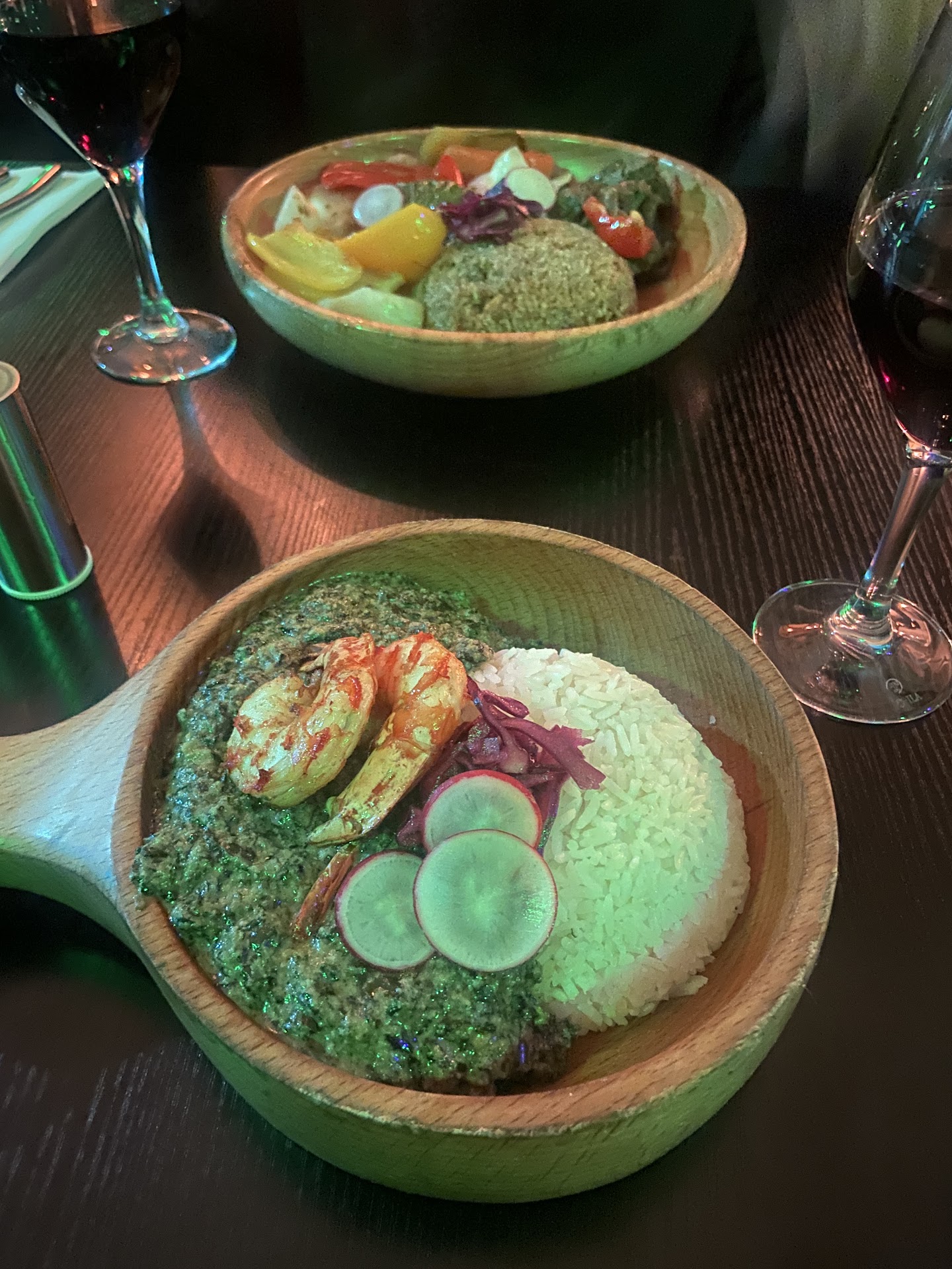 It’s great to have such a beautiful space serving african food. we had Ndolé which came with rice (would have been good to include plantain too especially given the price) and we also had meat Thieb. The portion sizes were good, enough to make you just full if you do not take a starter or dessert, which we didn’t . Overall, I found the food menu quite limited, with the main meals (at the baseline cost) being primarily rice- based dishes. Which brings me to the price point: those two plates of food plus two glasses of wine (€12 each) came to a total of €100 after TVA. While the food was relatively good (not outstanding but not bad either), value for money was not quite there. Also, they played African and caribbean songs which was cool but the music throughout the evening was extremely loud, making it hard to have a conversation as you would like to during dinner and I left with a mild headache. Finally, with the space being so big, it would have been nice to have more space between the seats to create some semblance of privacy. Overall, while the location in town is great, the space looks clean and beautiful, the service was quite efficient, the overall experience was average given the...