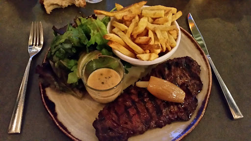 I ordered a sirloin steak which arrived with a small bowl of fries, side salad and a steak sauce. The salad was simply a bunch of lettuce leaves, the steak difficult to cut and somewhat chewy, the fries quite dry and overcooked (as though they'd rested somewhere too long or been reheated) which the meagre amount of peppercorn sauce wasn't enough to cope with the overall dryness of the meal.