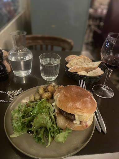 J’adore ce restaurant! I popped in here on a Thursday evening to eat solo having read good reviews. The outside looks really charming and I arrived at 7:30pm and it was empty but I’m sitting here at 9pm drinking my post meal cafe crème (lovely) and it is full! The outside is charming and inviting and the inside was the same! I felt a bit nervous/embarrassed with my lack of French but was greeted by a lovely hostess who immediately made me feel welcome and at ease. I love that the menu is small as I usually feel there is more thought and care put into each item. (True in this case). I ordered a lovely red wine (Cabernet franc from loire valley) (great affordable selection in multiple different sizes) and then had butternut squash croquette starter which honestly blew my mind. Incredibly tasty and light which I dont think I can say about any other croquettes I’ve eaten. Burger was cooked to perfection and I loved the side salad! I felt so welcome and at ease for dinner and would come back in a heartbeat! Thank you so so much Cherie Cherie for a wonderful first...