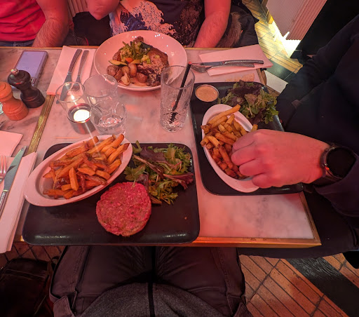 I had just arrived to Paris and from my hotel I found that it was the only proper restaurant open late at night that was highly rated. This was my first time in Paris and wanted to try something authentic, so I had the tartare and wine. The tartare was delicious but sadly there was a foreign object in my frites that I found as I was chewing. In their credit they tried to correct the situation as best as they could and replace the frites. I decided to decline the replacement in order not to make the situation worse.