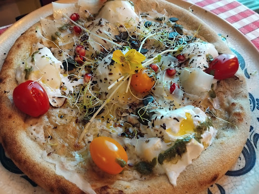 Read moreDîner un vendredi soir. Pizzas préparées comme il se doit avec des produits frais et découpés devant vous à la minute ! Le jambon de Parme, Rostello ou Spianata sont en effet découpés à la trancheuse par le pizzaiolo à CHAQUE commande. Le restaurateur s'approvisionne aussi auprès de la fameuse Laiterie La Chapelle, une institution du 18e, pour ses fromages en sus des fromages italiens de qualité qu'il propose aussi dans ses recettes. En entrée, il y a du houmous (original pour une pizzeria) servi avec des graines de grenade et une boule de pâte à pizza délicieuse servie bien chaude avec filet d'huile d'olive et graines de pavot. J'ai testé la pizza Assyrienne, farce faite maison de viande hachée, oignons, concentré de tomate, piment d'Alep, poivrons, persil et épices : excellentissime, une pizza qui sort vraiment de l'ordinaire, une pizza levantine goûteuse et addictive !! J'ai pu tester des fromages de la Laiterie dont la tomme fraîche, fondante, goûteuse, divine. Vins biodynamiques italiens, eaux, sodas, boissons maison (thé glacé, citronnade) et bières Theresanier connues pour leur qualité supérieure. Ce resto est une véritable pépite culinaire. La pâte à pizza quant à elle est un mélange de plusieurs farines de qualité, elle est très bonne et digeste. Bref, que du bonheur. Pas eu la place pour tester les desserts, j'ai vu du tiramisù (fait maison il va sans dire) et des crèmes renversées et crèmes chocolat provenant de la Laiterie, gage de qualité. Sinon, le chef utilise des graines germées et des pousses de sapin qu'il n'hésite pas à mettre sur les pizzas à la sortie du four ! Une pizzeria à tester absolument si vous êtes dans le quartier. Mais je préviens : le chef travaille seul, il gère le placement des clients, les commandes, la cuisine, le service, le paiement, le tout avec dextérité et sourire mais inévitablement il y a de l'attente, donc ne soyez pas pressés et pour ceux dont l'attente peut sembler longue, pensez aux heures de travail que cela doit représenter pour nous offrir des repas de qualité, ne serait-ce que la préparation de la pâte à pizza... Le tout à prix raisonnable. (14€ la pizza). Je lui souhaite une bonne...