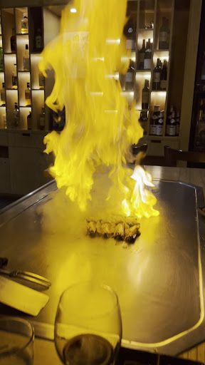 Ensuite, la nourriture préparée sur le teppanyaki était plutôt décevante. Le tofu n'avait aucun goût et le beignet au fromage était douteux. L'omelette n'avait pas grand chose de japonais si ce n'est sa manière d'être roulée, et les viandes et les poissons ne méritent absolument pas un tel prix. Le chef, malgré sa sympathie, faisait énormément de gestes superflus mal maîtrisés et a même fait sauter un aliment sur les genoux d'une dame plutôt que dans son assiette. Le wagyu n'en était pas, le canard était trop cuit et la tendreté des poissons laissait à désirer. La pièce de bœuf était plutôt bonne, mais les sauces une fois de plus trop sucrées et les garnitures (épinards aux cacahuètes, riz assaisonné, et légumes) plutôt fades et manquant de délicatesse. D'ailleurs on nous a enlevé l'assiette pour le deuxième plat sans nous laisser les terminer.
