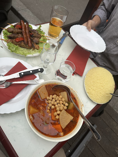 Le couscous serait prĂ©parĂ© dans la tradition comme au pays. Ce n'est pas le couscous gastronomique. Il n'y a pas les meilleures piĂšces de viande comme on pourrait en trouver chez "Le 404". Il ne doit pas y avoir un matĂ©riel de fou Ă ce sujet. Ce n'est pas le lieu oĂč j'ai dĂ©gustĂ© mon meilleur mĂ©choui. Mais la viande est correcte pour le prix, bien cuite, avec des brochettes bien grillĂ©es et un agneau bien confit et agrĂ©able. Tout est fait de façon honnĂȘte.