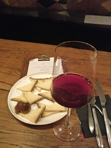 Instead, one of the very knowledgable and attentive sommeliers (in a non-pretentious way) will ask what you feel like drinking and then offer you some wines to taste - you then choose the one you like the most. Ask for a selection of cheese to accompany: all three on the plate we had were delicious (especially the truffle-infused Gouda, which was addictive). All at a very reasonable price too, despite our best effort/being in the touristy...