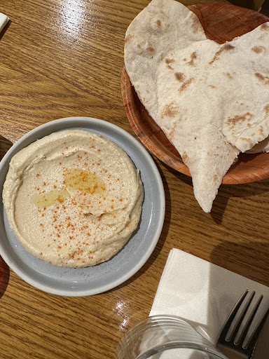 And the food did not disappoint. It was likely the best saj I’ve ever had - even compared to the options I’ve had at home. The chicken was tender and the composition of herbs and sauce were both cooling and deeply flavorful. The falafel was equally special, with a small tomato at the base, making each bite refreshing and a little more moist. The fattoush salad, though they used an iceberg lettuce that fell a bit flat in flavor, did not disappoint overall. The hummus was also great.