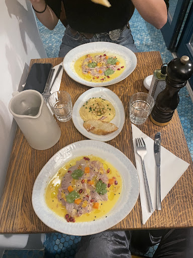 Read moreRue de Belleville, une adresse qui nous a naturellement interpellés. Une jolie petite devanture, petite terrasse carrelée et déjà, nous étions tous d'accord sans même s'être concertés. Comme un coup de tête, vraiment on s'y arrête. A l'intérieur, une déco sympathique portée sur des éléments littérature, photos et quelques monuments comme un Gainsbourg qui vous "photographiera" le temps d'un dîner. Une ambiance cocon et intimiste qui va bien, avec quelques tables seulement. La carte est simple, trois quatre entrées, trois quatre plats, de même pour les desserts mais on sait que toute la concentration et l'application en cuisine sera là, et le coup de tête répond plus que présent à l'appel de l'originalité, de la qualité de ce qu'il propose à déguster. C'est une cuisine qui change, rafraîchissante en ce mois de juillet et c'est tant mieux, parce que ce fut, pour nous quatre, à l'unanimité, une superbe expérience gustative. Supions chimi churi, ceviche de lieu, et final régal, crème fève de Tonka (exquis, vraiment). L'équipe est accueillante, souriante, et généreuse, à l'écoute et disponible. Adorable en somme. Quand l'un d'entre nous tente crânement de savoir si le chef partage la recette de la crème fève Tonka, le serveur acquiesce sans hésitation et c'est même le chef qui vient expliquer les détails de préparation, simplement et le plus gentiment du monde. Une superbe expérience. Entrée, plat, dessert, deux bouteilles de vin, pour un dîner sans retenue, comptez les 35/45€/tête, largement mérités sur le rapport qualité. Merci...