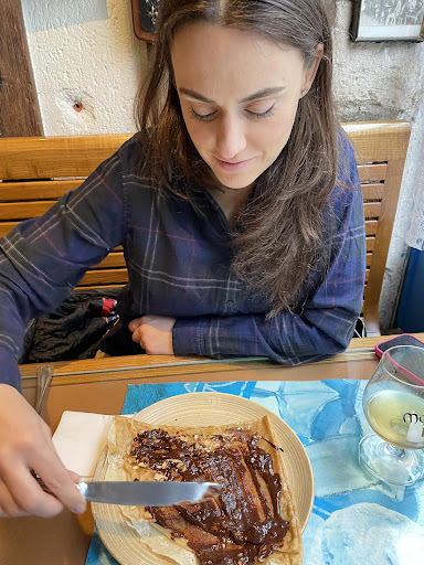 Food: The crepes were well cooked, beautiful, and HUGE. Most of us each ordered a meal crepe and a dessert crepe, and I don't think any of us finished. A meal crepe, which is quite a bit cheaper than a meal anywhere else we've seen in Paris, will definitely fill you up if you finish it. One word of caution: For Americans, French andouille is NOT the same as Louisiana andouille. It's instead chitterlings. I couldn't finish mine, but I also knew that was likely going in as, well, chitlings. (The flambeed calvados dessert, though, filled me up nicely!)