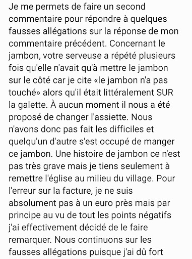 4- Enfin, le clou du spectacle : ma galette affichée à 11,50 € sur la carte, facturée 12,50 € sur l’addition. Quand je le signale, la serveuse reconnaît l’erreur… mais persiste à me dire que je dois payer 12,50 €, « parce qu’un autre client a payé ce prix-là ». Fascinante logique commerciale. Après insistance, elle daigne « exceptionnellement » m’accorder 1 € de réduction — en gros, elle a accepté de me faire payer le vrai prix. Et quand je suggère de mettre à jour leur carte pour éviter de tromper les prochains clients, sa réponse fut un superbe « on verra ça plus tard » sur un ton dédaigneux.