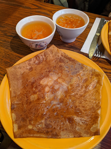 Read moreFound ourselves on a street lined with creperies in the Theater district so it was just the matter of choosing one. My Parisian friend said this place was Briton style, hence the special bowls/cups for the cider. Can't speak for the savory crepes but the family next to us was gobbling them up. Pictured is the caramel and butter crepe. The server had recommended when I couldn't make up my mind and I was a bit nervous because of how simple it was but I could have eaten about a hundred of those crepes and even now I'm thinking about getting the same kind of crepe again, so yes I recommend it. My only regret about this place is not getting the crepe that they light on fire. It looked...