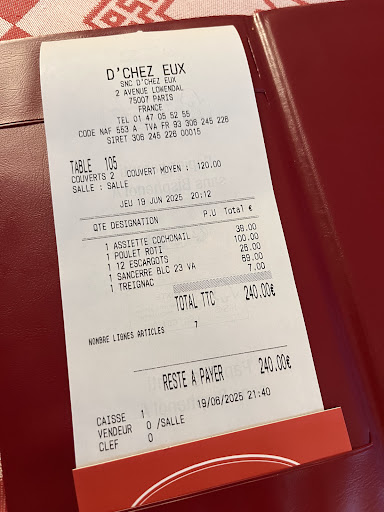 We paid €240 for two people (receipt attached), which was far beyond the value we felt we received. The dishes lacked refinement, and the overall experience was disappointing.