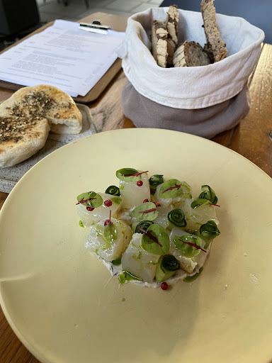 First they start you with a complementary toast/waffle piece with a salmon mousse. Delicious! I ordered what I believe was almost a pollock ceviche appetizer and it was fantastic! All the bread is delicious here as well. For main course I opted for the poultry (Guinea fowl) which was equally tasty. It was neat the way they plated the white and dark meats separately. For dessert I tried the âChocolatâ which was kind of in between a dark chocolate cake and mousse; and it had an accent small scoop of orange ice cream. Perfect end to the meal. Last but not least they brought mini cream puffs with the check.