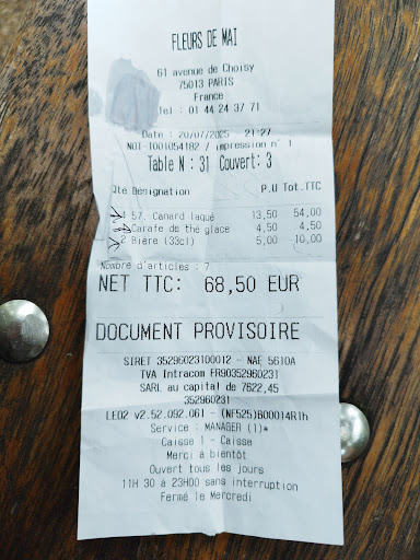 Je confirme l'avis précédent concernant le canard laqué à 54 euros... Cette après midi je m'installe en terrasse pour commander un canard entier afficher à 33 euros et je précise que sur la carte il y'a pas de canard entier ni de demis et ni de quart ! Il y'a une affiche seulement en vitrine (à revoir). L'addition arrive avec 2 bières pour 10 euros et surprise un canard de luxe à 54 euros haha. Le damme qui explique que sur la carte il y a pas de canard entier mais une portion de 1/2 à 27.00euro. Je ne pense pas que les clients ne savent pas lire comme vous l'indiquer mais plutôt vous qui arnaquer les clients tout simplement donc arrêtez de vous justifier pour mille et une raison et assumer votre escroquerie. Je ne remettrai plus jamais les pieds chez vous en plus pour s'asseoir en terrasse juste à côté de plusieurs sans abris qui squatte à 1 metre de votre terrasse et qui fume à tous va. La serveuse le voit bien et ne dit absolument rien. Et je précise que sur votre carte il y a pas de 1/4 comme vous dite ! Je ferais pass3cette information a tous mes proches pour qu'ils évitent de se faire arnaquer. UN CANARD À 54 EUROS !! Du jamais vu. En attente de votre réponse, cette fois ci faite preuve de moins d'imagination. Et pour info le canard n'est vraiment...