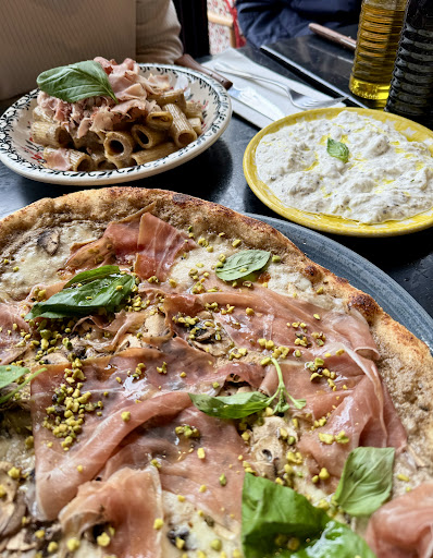 Nous avons également partagé une pizza « Tartufoparma », garnie de crème de truffe et de jambon de Parme. La pizza était immense, avec une pâte fine et croustillante. Le jambon de Parme, par son goût intense en bouche et aux feuilles de basilic de la fraîcheur rendait le plat équilibré. Les pistaches concassées ajoutaient du croquant et un joli visuel. 🍕