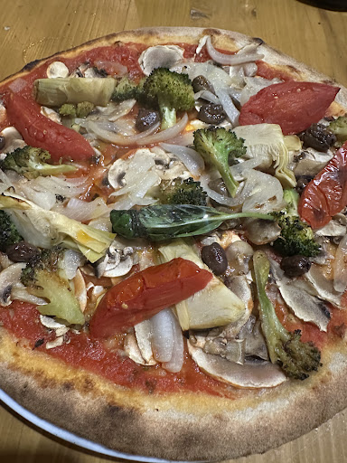 J'avoue ne pas trop comprendre ces avis dithyrambiques sensés faire de cet endroit la meilleure pizzeria de Belleville (??)... ça me laisse pantoise tant je n'ai pas trouvé grand chose à la hauteur... Le service ressemble déjà à du grand n'importe quoi...le jeune homme bien que sympathique, , ne sait pas faire deux et encore moins 3 choses à la fois malgré l'affluence autour d'une petite quinzaine de tables qui le dépassent !... prendre la commande de plusieurs tables d'un seul tenant, ou amener une bouteille d'huile aux uns et l'addition aux autres d'un seul mouvement ne semble pas dans l'ordre de sa logique qui est pourtant celle du métier...total placé autour d'une table il faudra attendre 30 mn montre en main pour qu'il vienne prendre la commande 🥴...puis 17mn pour que les assiettes arrivent... Alors ces pizzas sont grandes dans l'assiette, oui car très étalées, la pâte qui sort du four est croustillante forcément...mais totalement insipide... Quant à ce qu'il y a dessus...euf que dire sinon que l'on semble faire des économies drastiques sur à peu près tout... Pour une "Artichauts must go on" artichauts, crème, champignons, mozzarella, basilic, jambon cru grana Un minuscule coeur d'artichaut tout droit sorti d'une conserve assez médiocre divisé en 4, 1ou 2 champignons de Paris émincés fins sans goût, des points éparses de mozza de vache caoutchouteuse ...sans goût... 2 minuscule têtes de basilic pas plus grandes que la dernière phalange de mon petit doigt, quelques tranches ultra fines de jambon cru trop cuites ultra salées et sans saveur et pour le grana 🤣... j'ai vu, de mes yeux le cuisto en déposer promptement une minuscule pincée sur les bords après cuisson...au milieu de tout ça un peu de crème fraîche semble t'il...qui a séchée à la cuisson Verdict : un look incapable de jouer sur la sapidité...heureusement qu'on avait bien faim 👍🏼😅, une total disproportion pain/ ingrédients, une grande pizza traduisant un grand vide qui arrive dans l'assiette sans être passée sous la roulette et un festoyement en bouche d'une insapidité remarquable! 👏🏼 Mon voisin d'en face avec une "Vamos à la playa" ne semblait pas mieux loti...et manifestement les quelques habitués semblaient avoir bien compris que l'on s'en tirait mieux avec les...