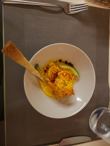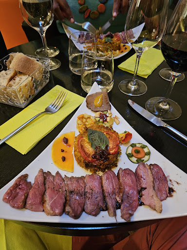 I had such a wonderful experience. The owner couple were so warm and friendly. The owners don't speak english, but the waitress does and she was super attentive to all our needs. We ordered the 4 course menu; shrimp and avocado in lemon and safran sauce, duck and vegetable cake, cheese plate, caramel creme. The vegetable cake was especially tasty, but the cheese platter was a little too much for us😂 Maybe reducing the cheese a bit and adding some jambon and crackers would be better? We also ordered the wine menu. The pairing seemed a bit off sometimes and the wine itself weren't fabulous, but it was a great way for beginners like us to taste wines from different regions in France. They were generous enough to offer a second glass of dessert wine. Overall, a reasonably priced restaurant to have some good food and wine in a lovely warm atmosphere! Merci!