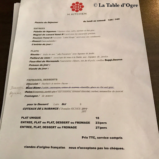 Here is a small restaurant that succeeds in offering creativity and quality for a reasonable price at lunchtime. The self-styled ‘neo-bistro,’ initially a hidden gem known mostly by word of mouth, has quickly gained a growing reputation. Young and discreet Japanese chef Hidenori Kitaguchi playfully mixes culinary traditions, using elements of French cuisine while retaining the delicateness of Japanese cooking. The result is that you can enjoy a three-course lunch without feeling stuffed after it. The choice of dishes is large, and changes regularly. Several plates on the current lunch menu are highly recommended. They include tête de cochon (pig’s head); foie gras (duck or goose liver); Japanese-style seafood; pied de mouton (sheep’s head); and cod tastefully served with mushrooms or vegetables. The seafood risotto is made with a delicious stock, and remains a great memory from recent visits. As does the octopus, served both as an appetizer and a delicious dessert made with fresh mango. Tea and coffee bring a nice surprise, served with complementary home-made twisted guimauves (that’s marshmallows, French style). Located in a quiet street, H. Kitchen is very simply, almost austerely, decorated. The staff are attentive and willing to give advice on the various dishes, and the atmosphere is cozy and peaceful. All in all, a lovely place to escape the noise of the city and enjoy elegant and savory food, without...