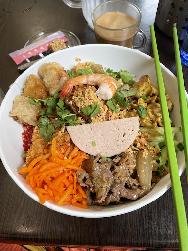 Amazing Vietnamese food in Paris! I was here yesterday for Pho and back today to have their Bo bun special! I have had many Bo bun before but this one is packed with toppings! From memory there were 9 different toppings, fresh prawn x1 , prawn fritters x2, sugar cane prawn (guess it’s not easy to get sugar cane in Paris so they replace with lemon grass), half a mix fritter (pork, prawn and veg), a few fried chive dumplings cut in half, fried Vietnamese spring rolls, a slice of Vietnamese ham, stir fried beef pieces, satay chicken pieces! Came just after noon and within minutes a long queue started to form! Very limited seating so come early or...