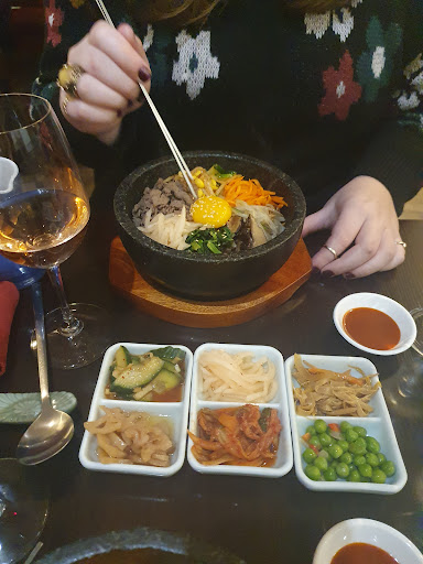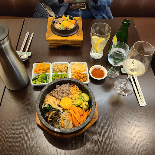 Kimchi, Korean BBQ meats & bibimbap rice dishes at a straightforward restaurant with a patio.