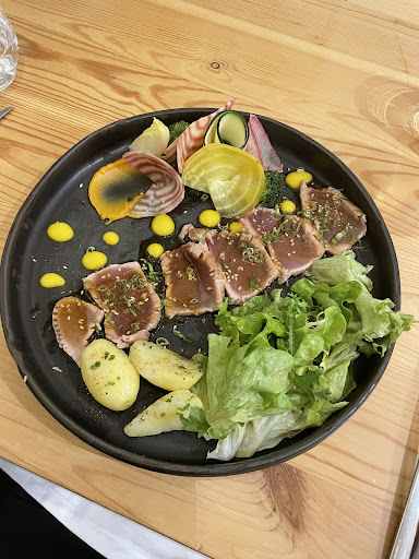 Read moreWhat a find! We walked to Huîtres et Saumons de Passy and arrived ready to enjoy our meal. We were warmly greeted and given a choice of table. (Wish we had seen that the door to the "toilettes" was right there.) The menu is just the right size- not too many choices and many were appealing. Two of us chose the pavé de saumon/sauce saboyan and the pommes de terre mille feuille. Simply superb! The potatoes are thinly slices and arrive in a browned rectangle. They could not have been better. The salmon was cooked perfectly, succulent and bursting with flavor. The 3rd member of our party ordered the tataki de thon, beautifully plated and cooked perfectly. I ordered their home-made ice cream: one scoop of vanilla and one of chocolate- not too sweet and incredibly creamy with a depth of flavor. The servers, the "maître de", everyone working were warm, professional, and attentive to the perfect degree- no hovering, but there when we needed them. We heard Spanish, English, and French spoken- and the noise level was very low, the ambiance ideal for a lovely...