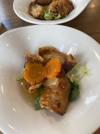 Lunch menu: 16 euros starter of the day: fried veggie ravioli with a sweet and sour sauce. The sauce was good. The dumpling skin was thin and crispy, we liked it. The stuffing was a bit bland though. Main dish: 4 choices among bibimbap, stir fried glass noodle, sweet and sour chicken, spicy chicken soup. The beef bibimbap was delicious. On top, we were culinary students so we were satisfied when seeing vegetables properly cut! The bowl was super hot, we can hear the rice sizzling for a couple of minutes. The chicken soup dish totally lacked of flavor. It's like water with spice rather than broth. Each dish was served with 3 small side dishes that they call "banchan" in Korean. This time we had a mixed mash potato that tasted similar to Russian potato salad, kimchi and the third one was something like cabbage stir-fried in sesame oil. dessert of the day: chocolate cake, not bad but a bit heavy and sweet to our taste especially after a bowl of bibimbap, would be nicer with a simple creme anglais to accompany the cake to give more moisture