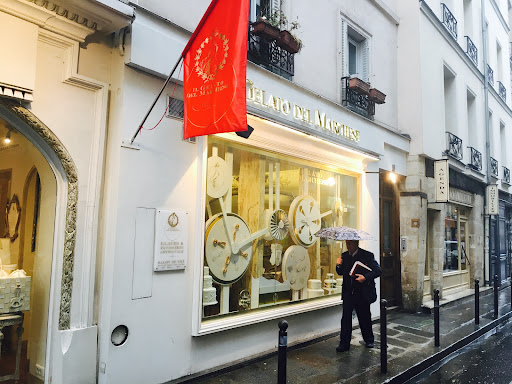 I’m back on rue des Quatre Vents, in a wondrously luminous establishment. In the window large animated circles are on display, as at World’s End, Vivienne Westwood’s legendary clock shop, where the hands turn counterclockwise. This image fits the place perfectly, Il Marchese del Gelato, is a delightful tearoom launched by epicurean aesthetes from Rome and Tuscany. There’s no need here for HG Wells’ time machine, nor for Dr. Emmet Brown’s De Lorean in Back to the Future in order to travel in time: splendid armchairs, Regency sofas, flamboyant crystal chandeliers, Saxony porcelain cups, silver spoons and tea pots which would never make Marie Antoinette homesick. Veronica is at the heart of the time warp in the zeitgeist of the Saint-Germain des Prés neighborhood, a warm host with very discerning taste.