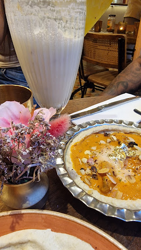 Read moreNous avons apprécié notre moment chez Ismaïl. Deco : Très soigné jusqu'au moindre détail, le verre à eau gravé Ismaïl, les decos murales, etc. C'était un beau cadre pour dîner. Service : Efficace et sympathique. Nous avons tout d'abord été servi par un gars super sympa, qui nous a proposé des recommandations pertinentes, qui n'a pas hésité à ouvrir un bocal neuf de pickles de mangue pour qu'on puisse tester avec nos naan. Il avait un ton aussi très accueillant. Les autres serveurs étaient souriants et accueillants également, malgré l'affluence. Cuisine : nous avons été franchement transporté. Adeptes de la cuisine libanaise et indienne, nous sommes exigeants, surtout quand il y a ce genre de fusion. Et bien nous avons apprécié notre diner et les choix que nous avons fait. C'était plus raffiné que dans les restos que nous avons l'habitude de faire, que ce soit visuellement ou culinairement. Le lassi à la fleur d'oranger n'était pas trop sucré ni trop chargé en fleur d'oranger. Les naans etaient fins et pas grossièrement rempli au cheddar et piment (pour le chili naan), c'était subtil le piment. La combinaison du houmous butterchicken était étonnante mais se mariaient bien. Pour le plat du chef avec une sauce coriandre pistache et proteine (poulet et agneau pour nous), c'était bon, original mais ce qui nous a le plus surpris c'est le riz aux céréales qui l'accompagnait, un mélange de texture qui matchait parfaitement au plat. Coté dessert, la glace à la pistache et fleur d'oranger était vraiment maison. Une texture un peu comme un sorbet, la fleur d'oranger était bien dosé mais un peu trop de pistache à mon goût, trop de croquant pour notre palais. Et je ne vous parle même pas des quantités généreuse. Heureusement qu'il existe des doggy bag, ja n'ai pas pu finir mon plat. Nous reviendrons sans hésiter pour tester...