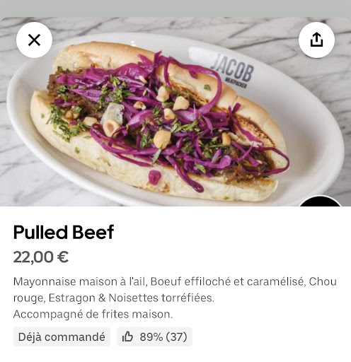 L'adresse m'est donné par un amis, je vais travailler tard, je commande donc sur ubereat. Je regarde la carte, le "Motz" est considéré comme "populaire", il me plait bien je commande. je m'attends donc à recevoir un burger avec des frites comme je vois les autres photo de burger avec des frites (le motz est pris en photo de près, je ne vois pas de frites, mais je ne me pose pas la question). Comme un burger + frite ça cale, je ne prends rien d'autre. Et bien 15.90 € plus tard, je suis affamée. Le Burger est bon, pas de problème, même si le pain est clairement huileux, je comprends mieux la petite lingette pour les doigts dans le paquet. Les autres burgers étant vendus avec des frites, pourquoi il n'est pas spécifié sur celui qu'il n'y en a pas ? Pourquoi le site ne recommande pas de prendre des frites en sus car il n'y en a pas avec ce burger ? Donc là il est 21h, je suis au bureau pour encore un moment et je crève la dalle... pas cool :( Et j'ai une petite sensation de vol qui me reste en bouche. PS : le burger classique à 16.50€ est vendu avec des frites, donc le prix ne m'a pas aidé à faire le distingo...
