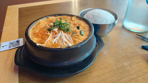 I usually do not leave reviews unless it was really bad or really good, for other customers' sake. But as a Korean, I would have to say this place is not where you should go if you want real authentic Korean food. I had Sundubu Tofu stew but it was not at all like what I get in Korea. There is no depth and flavor in the soup (so much foam and oil too! Take a look at the photo), would not recommend. I only went because it was at a time where most restaurants are on breaktime (3pmish) and was close to where I was passing by. It is located in a very convenient place where it could attract customers, and has a lot of space with good ambiance, however due to the quality of the food, slow service (despite not so many customers, more from lack of staff's concern of customers), and the fact that they do not turn on AC in this hot summer weather, I don't think I will ever come again. I left the restaurant very sweaty and very disappointed. I hope this place doesn't degrade the expectations of those who are trying Korean food for the first time. I really hope the restaurant improves itself for its own business sake, its customers, as well as their staff (they seemed so exhausted I almost felt bad for them), you...