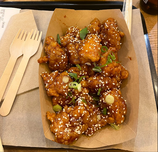 Le K-bowl est assez chouette car il propose une bonne balance entre riz, poulet frit et pickles. Pas fan des choux fleurs frits par contre (alors que j'adore ça normalement) que j'ai trouvés mous et sans saveur ; on ne sentait que la sauce autour. Par contre je les avais pris en Uber Eats donc peut-être que c'était pour ça qu'ils étaient mous.