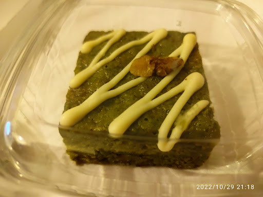 En dessert, j'ai commandé : brownie matcha (au dessus, on peut constater du chocolat blanc qui est réellement sucré tandis que le gâteau à un goût de matcha (pas amer je trouve) avec l'ajout des morceaux d'arachide ce qui les combine très bien. Il est succulent. daifuku yomogi = délicieux du fait que la pâte est molle non sucré qui est constitué d'herbe japonaise selon eux (un délice) puis à l'intérieur des haricots rouges