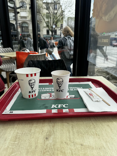 This KFC is right on Avenue D’Italie and Rue de Tolbiac. After walking for two hours I wanted an affordable place to get some coffee. In addition I wanted to do some people watching 😂. Almost all restaurants with seats and tables on this busy street charge an arm and a leg for a cup of coffee ☕️! And I wasn’t hungry to eat yet. So I saw this KFC and I’m not normally a KFC girl, and saw that they have seats and tables inside with the wall all glass in which you can people watch and enjoy a warm sitting, in this freezing weather in April! I ordered a lungo which is basically a watered down Americano ( you will get used to it when you live in Paris). And within 2 minutes the nice girl came with the coffee (lungo) and a complementary water! How cool is that for a €2! Of course you can enjoy all what KFC has to offer but I’m on a diet ( sorry KFC, you got a customer that always dieting and never loses weight LOL. All in all, this place is awesome for the tired and hungry people who just want to recharge and eat/ drink/ people watch without spending their month salary...