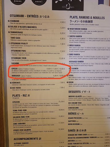 I will sadly never come back here, i hate being yelled at in the street and treated like a thief by a very rude and frankly dishonest waiter. I'll try to explain as objectively as possible so that the restaurant doesn't reply saying I'm a liar on top of that : We asked for 6 gyozas as we saw it was 7€ (without any other indication as you can see, 6 gyozas=7€), we hesitated which to chose so the waiter told us we could mix if we want to have 3 of both, which we agreed. But despite what the restaurant response below indicates, no, the waiter didn't clearly indicate anything else, he just said we could mix if we want, we thought it was nice. The gyozas arrived, they really weren't great at all and no "home made sauce" were brought with by the way. The ramen was good. When we're done, we leave 21€ on the table and leave. The waiter chased us outside, saying there's 90 cents missing. Uh ? 7+13,9 =20.9€ though, how come ? Well if we mix 3 gyozas of each we need to pay 4+4, not 7... I point to him that nowhere this is written on the menu and most importantly, he never mentioned it to us (once again, despite what they replied here below, he didn't, it's a flat out lie). We look back at the menu it clearly says 6 gyozas=7€, simple as that. In ANY other restaurant I can think of, they would admit they were wrong (after all, the customer's always right, right ?) and leave it at that, we're talking about 1€ after all, but noooo, not here, the guy replied something in the lines of "hey, I'm a commercial, i don't have to tell you that" and kept pointing at the menu, like i was stupid or something.. Yeah, I might have taken it a bit too seriously and raised my voice a little in response, but I was shocked they didn't even consider my side and agree that this was misleading, just threatening me with "you're not leaving without paying it". And seeing how they double down in the comments here, without a single aknowledging or apology to me proves the lack of customer appreciation they have in this restaurant, what a shame.